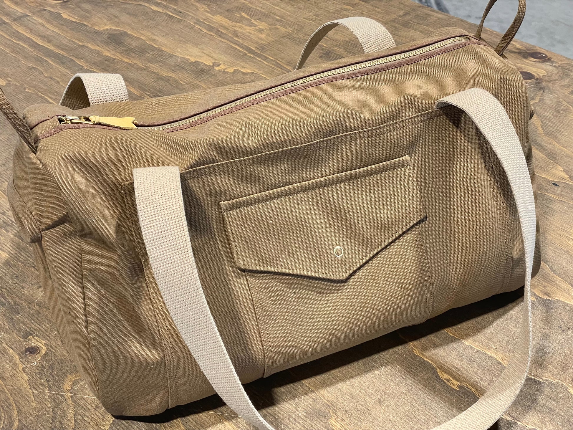 Medium sized duffel bag, great for short trips or traveling light. Approximately 20” long, 12” deep at base and 10” tall.