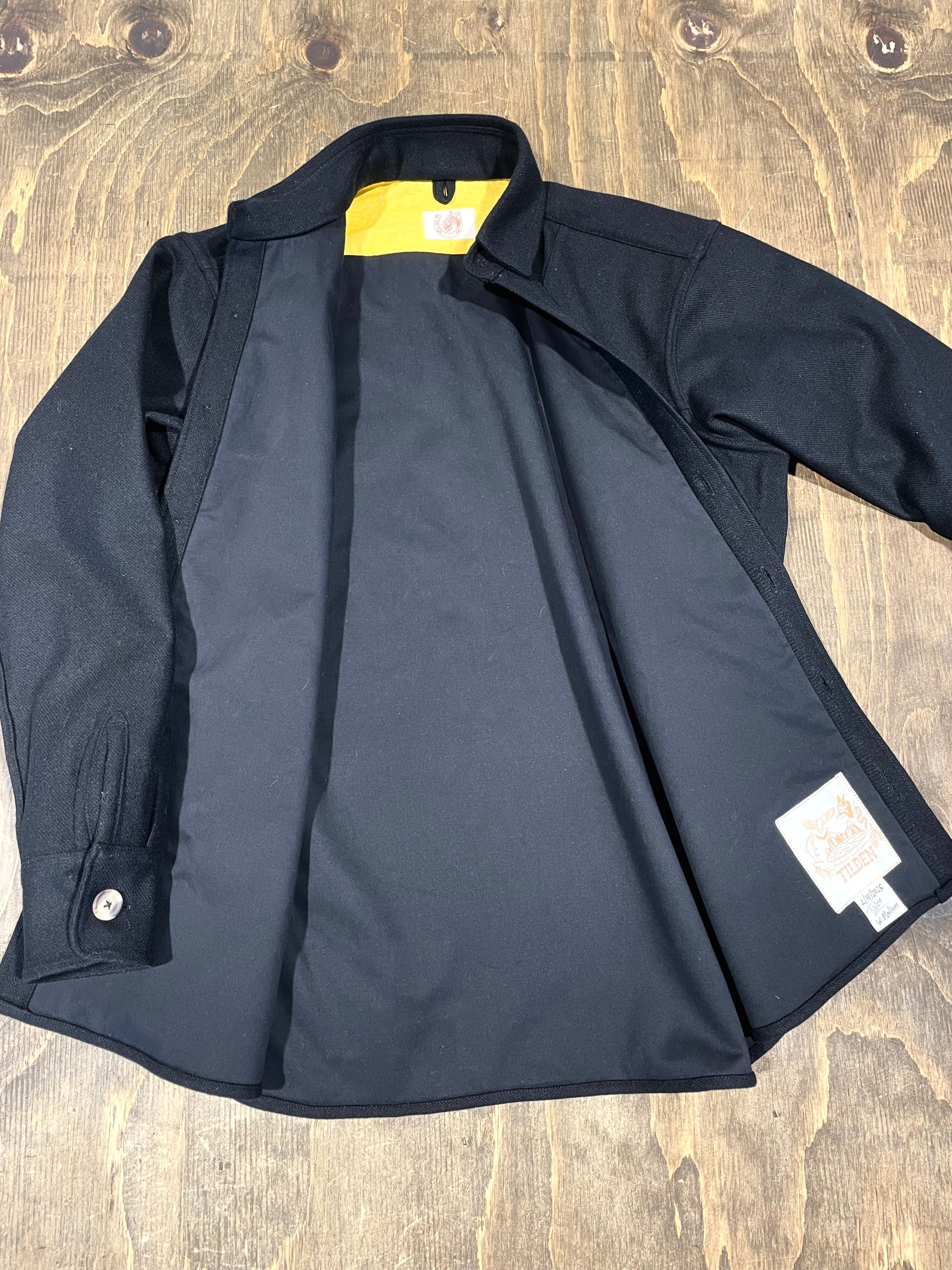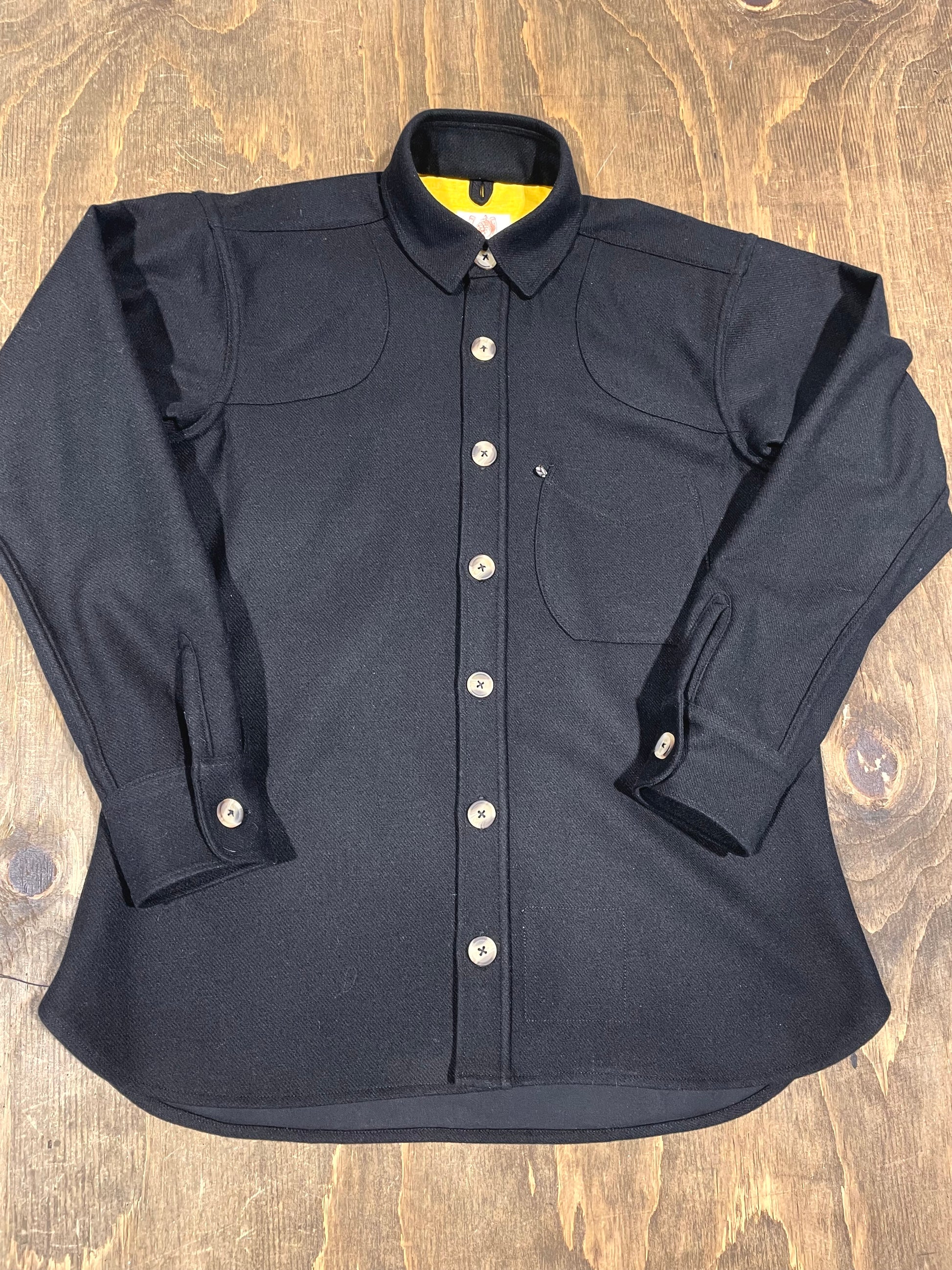 Steelhead Shirt in black American milled medium weight wool flannel. Super soft and warm, lined in fine cotton French Twill. Photoshoot sample in size Women’s Medium, 22” chest. Single pocket, horn buttons, brown gross grain ribbon detail.